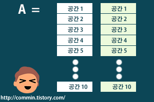 그렇습니다. 앞에 있는 대괄호 안에 숫자 2는 줄의 갯수를 의미합니다. 그리고 뒤에 있는 대괄호의 숫자는 줄의 크기를 의미하죠. 그러니까 두줄로 줄을 서는데 한줄에 최대 10개씩 설 수 있다 라는 의미입니다. 그러면 int A[][][] = new int [2][2][2] 는 어떻게 구성이 될지 감이 오실까요? 안오시겠지만 한번 생각해보세요. 별거없습니다. 생각해보시고 모르시겠다면 댓글 남겨주세요 ^^ 3차원이상의 다중배열은 다루지않겠습니다. 잘 안쓰니까요^^; 그러나 한번쯤 생각은 해볼필요가 있습니다.