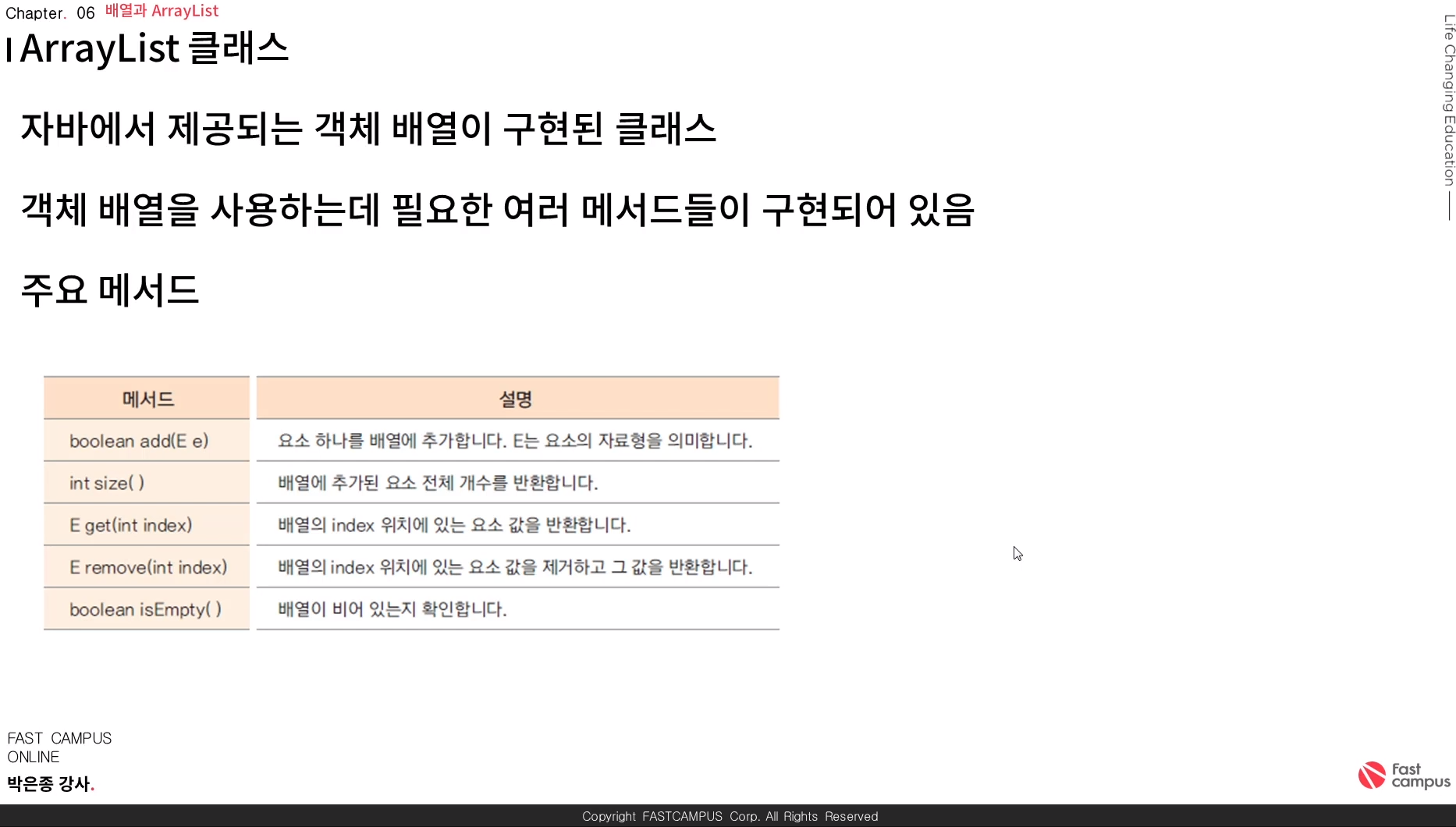 ArrayList선언시 ArrayList list = new ArrayList()로 선언 후 내부에 임의의 값을 넣고 사용할수도 있지만 이렇게 사용할경우 값을 뽑아내기 위해서는 캐스팅(Casting) 연산이 필요하고 잘못된 타입으로 캐스팅을 한 경우에는 에러가 발생하기에 위와 같은 방식은 추천하지 않습니다. ArrayList를 사용할시에는 ArrayList에 타입을 명시해주는것이 좋습니다. JDK 5.0이후부터 자료형의 안정성을 위해 제너릭스(Generics)라는 개념이 도입되었습니다. ArrayLIst<String> list = new ArrayList<String>(); 이라고 되어있다면 String객체들만 add되어질수있고 다른 타입의 객체는 사용이 불가능합니다