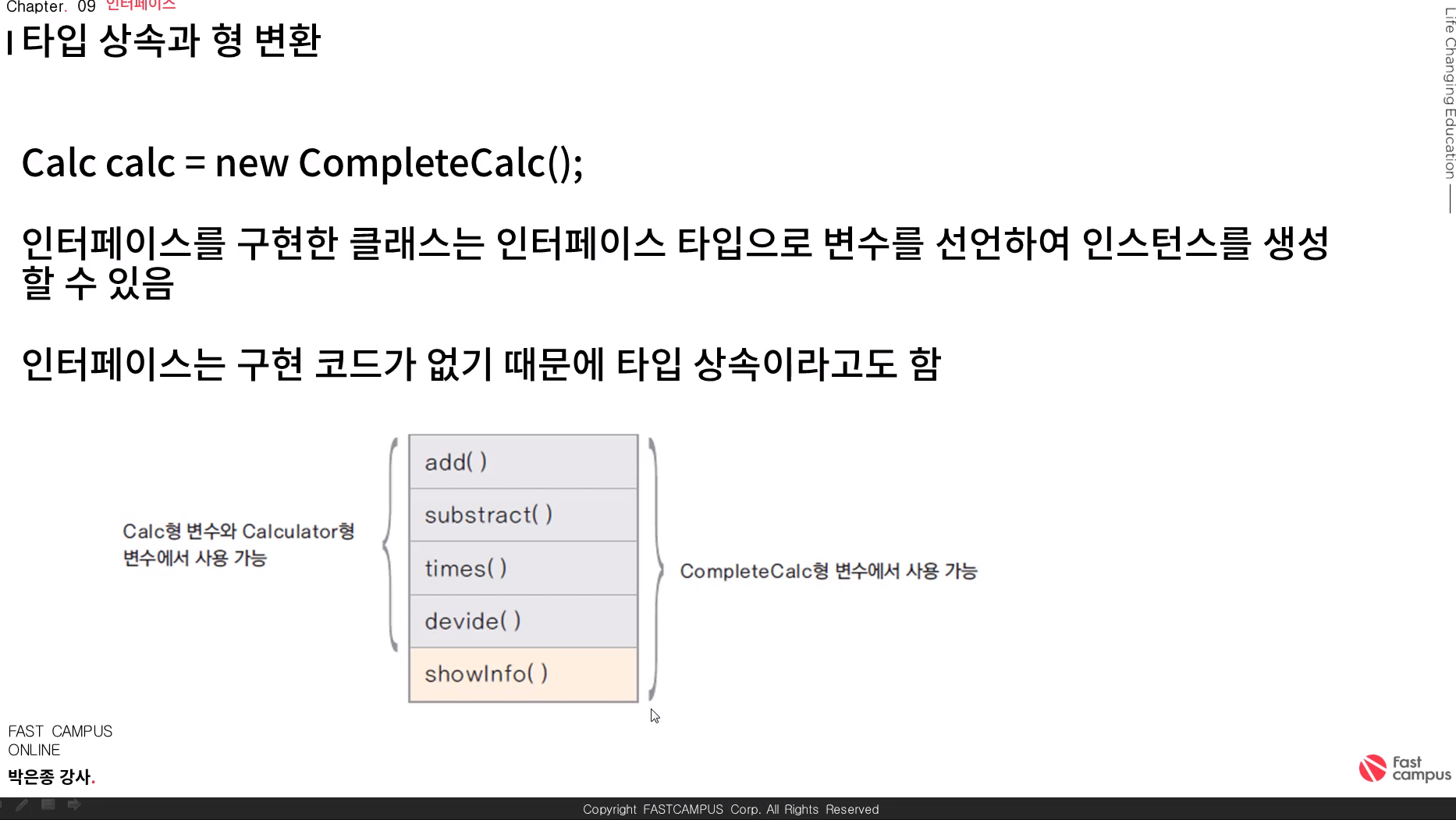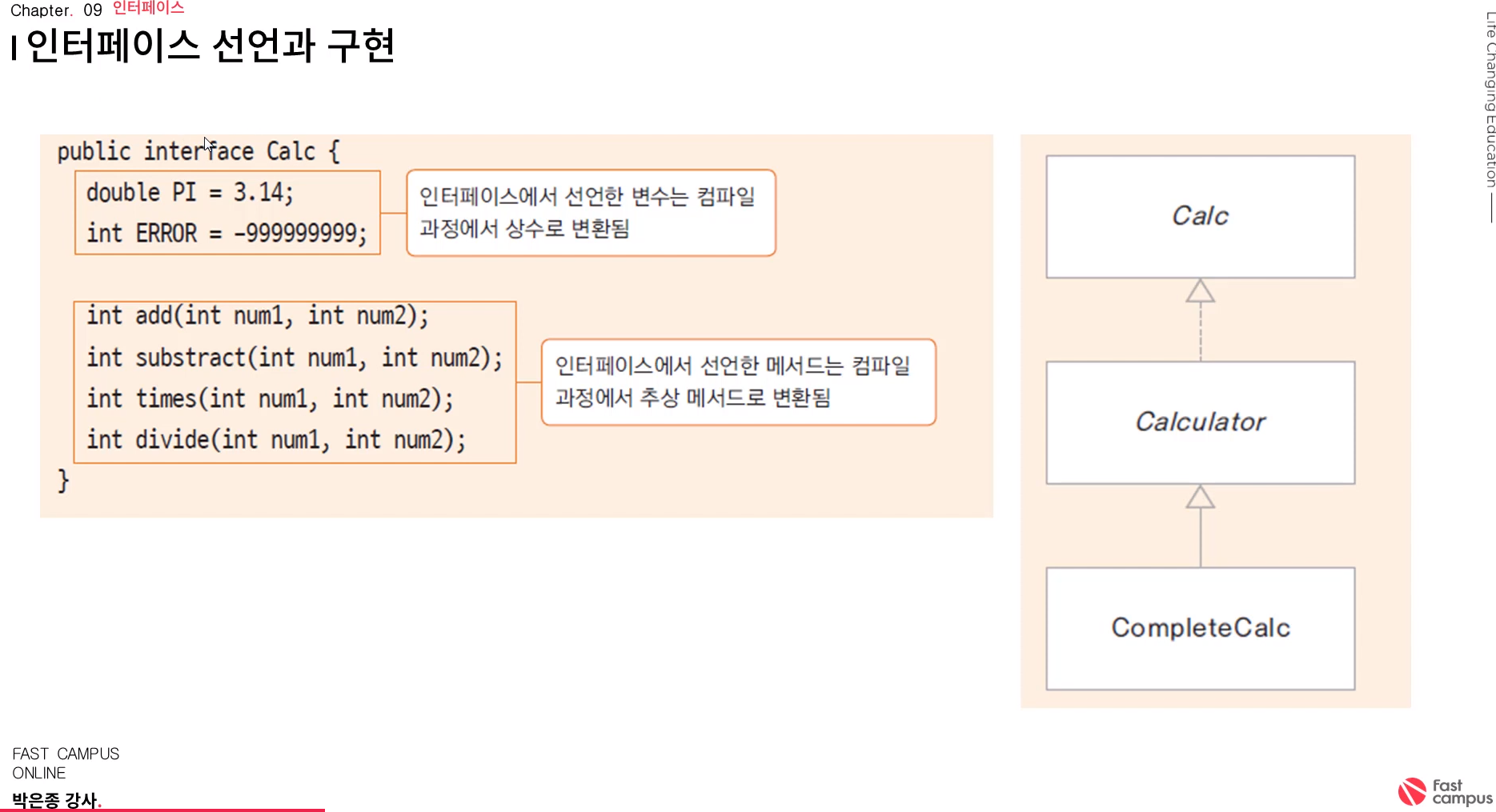 구현부가 없으므로 인터페이스를 만든다면 반드시 구현하는 클래스를 만들어야 하며, 인터페이스를 구현하기로 한 클래스는 반드시 인터페이스에 명시되어 있는 추상메서드들을 모두 구현해야 한다. 만약 이를 구현하지 않으면 컴파일 에러가 발생한다