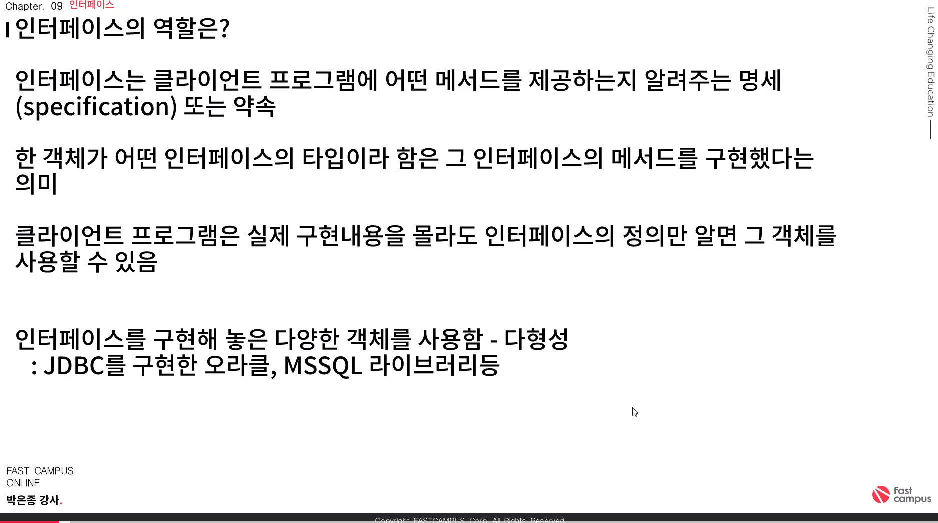 인터페이스는 구현체가 없다. 이를 구현한 클래스에서 모든 구현체를 만들어야 한다.(default 접근 제어자 제외) 예를 들어 한 인터페이스를 구현한 A, B 클래스가 있다고 하자. 현재는 A 클래스를 사용하고 있지만, 인터페이스를 잘 설계했다면 다른 기존 코드의 변경이 거의 없이 B 클래스로 쉽게 변경할 수 있다. 자바의 JDBC가 이렇게 구현되어 있으며, 스프링에서도 대부분 이러한 인터페이스 장점을 잘 활용하고 있다.