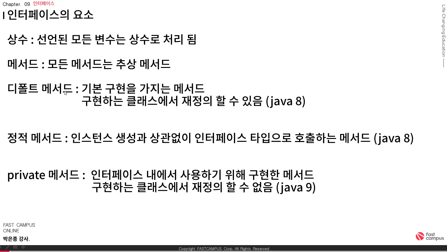 인터페이스는 기능에 대한 선언만 가능하기 때문에, 실제 코드를 구현한 로직은 포함될 수 없습니다. 하지만 자바8에서 이러한 룰을 깨트리는 기능이 나오게 되었는 데, 그것이 Default Method(디펄트 메소드)입니다. 메소드 선언시에 default를 명시하게 되면 인터페이스 내부에서도 코드가 포함된 메소드를 선언 할 수 있습니다. (접근제어자에서 사용하는 default와 같은 키워드 이지만, 접근제어자는 아무것도 명시 하지 않은 접근 제어자를 default라고 하며 인터페이스의 default method는 'default'라는 키워드를 명시해야 합니다.)