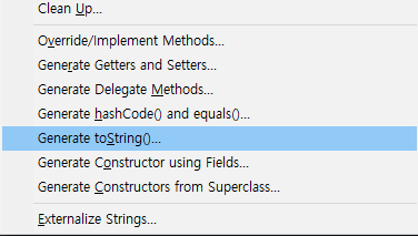 이클립스에서 만들어주는 toString() 오버라이딩 메소드입니다. 보기 편한대로 바꿔서 써도 됩니다. 디버깅할때나 값을 출력해서 보고 싶을 때 매우 편하게 사용할 수 있습니다.
