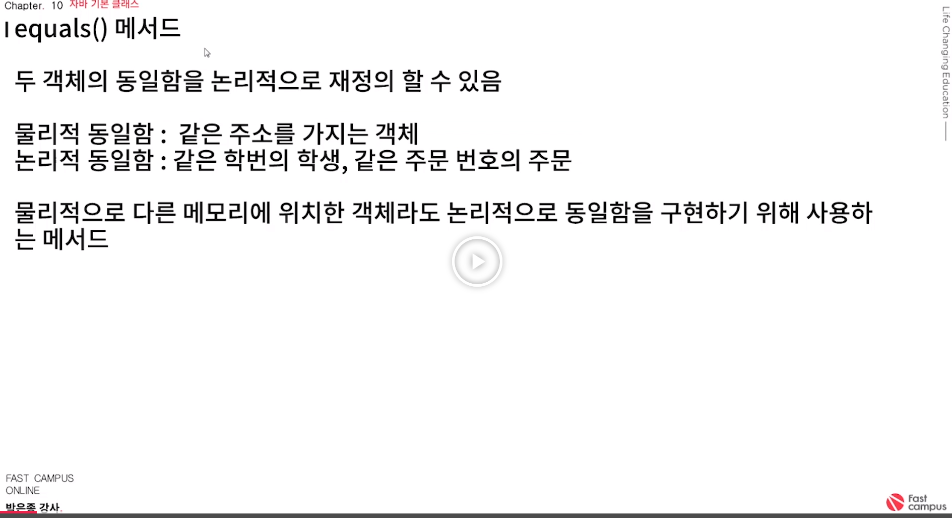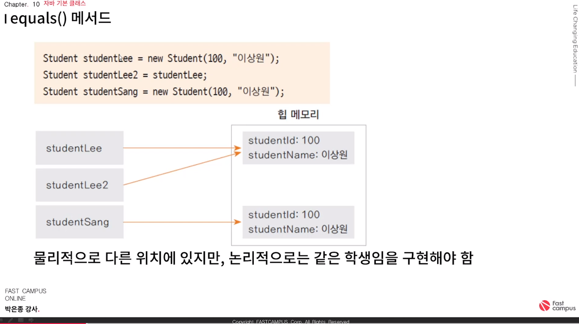 - 이런 경우 Object의 equals가 논리적 동치성까지 확인해준다고 볼 수 있다.