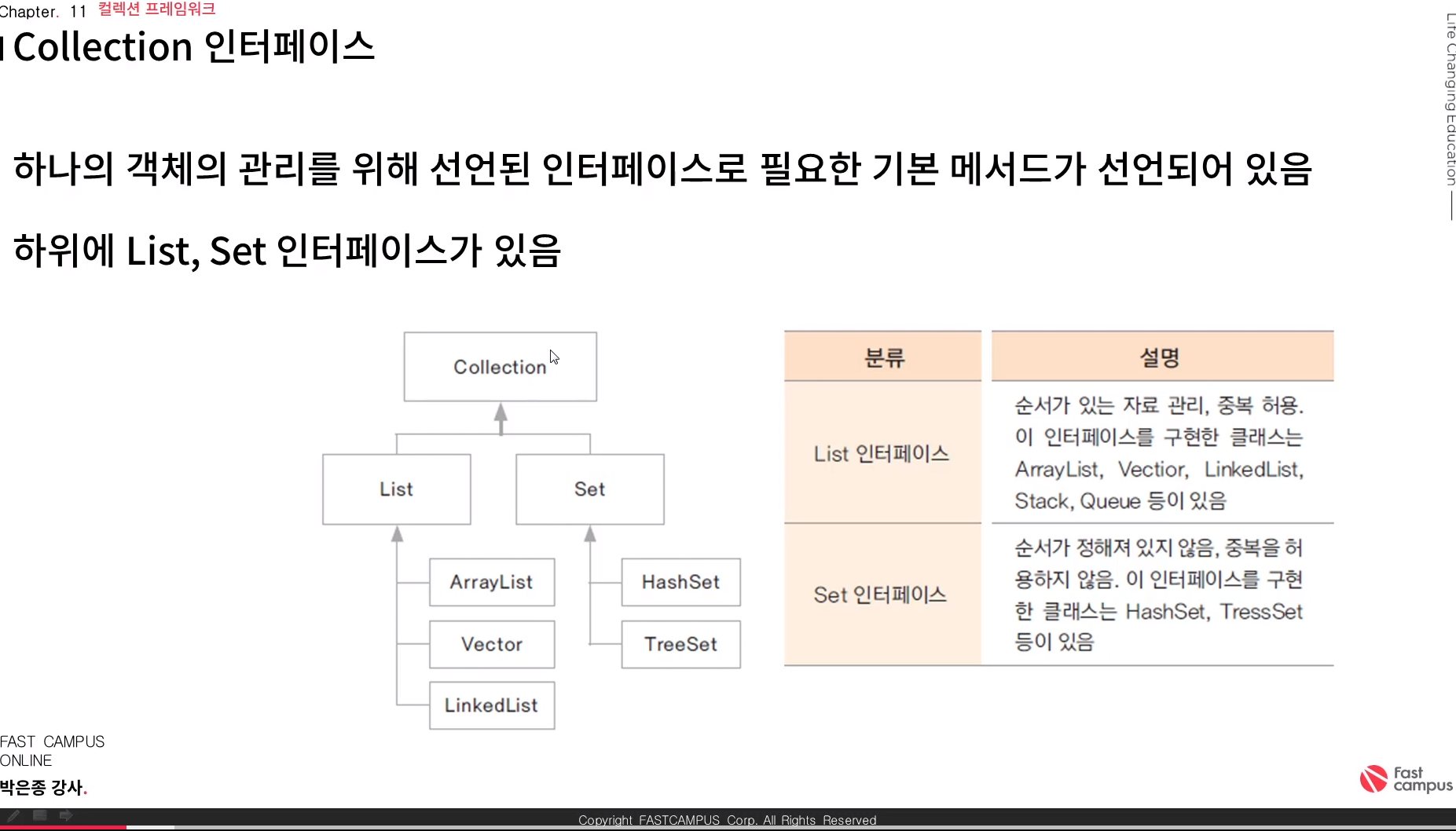 따라서 List 인터페이스와 Set 인터페이스의 공통된 부분을 Collection 인터페이스에서 정의하고 있습니다.