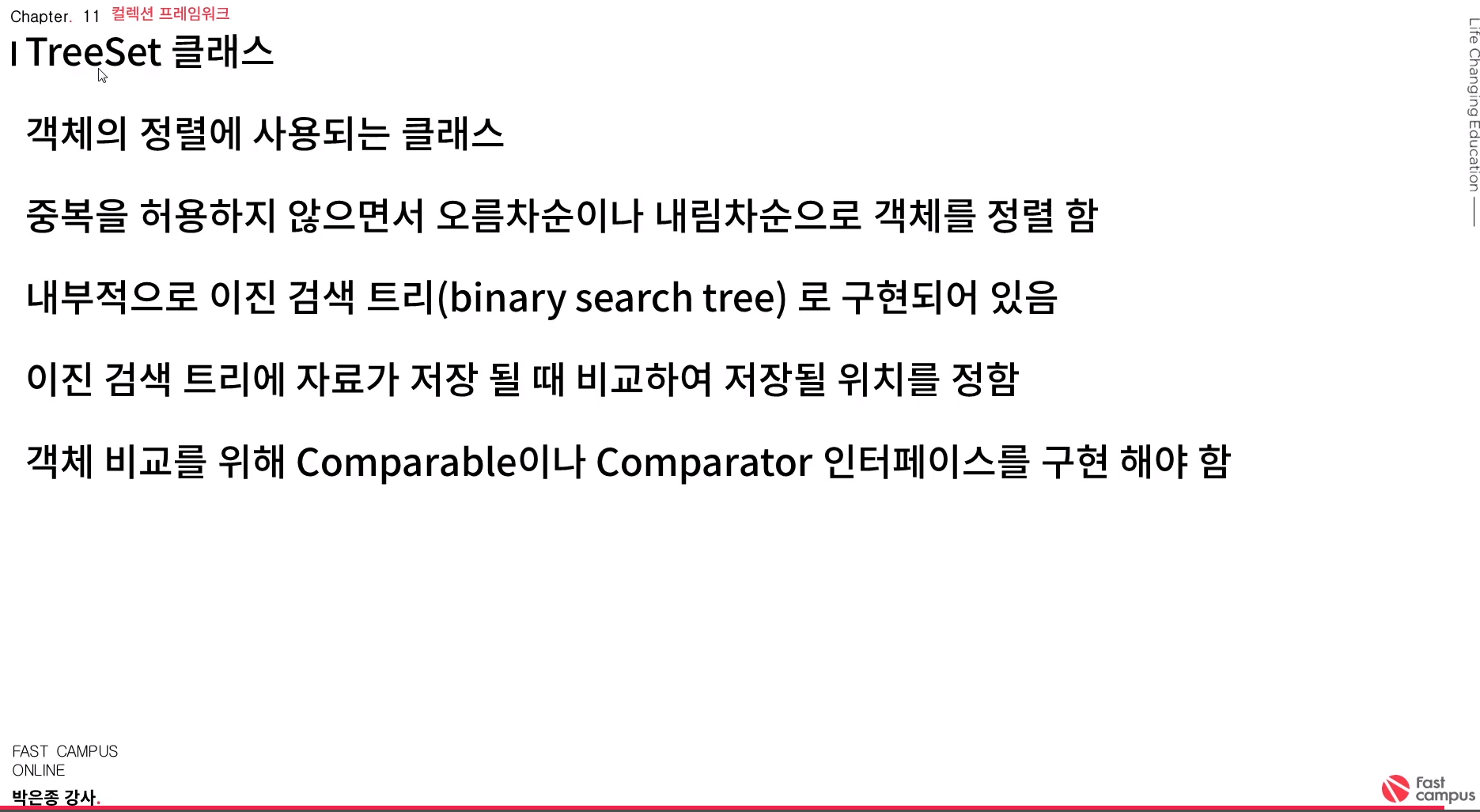 TreeSet이란? JDK 1.2부터 제공되고 있는 TreeSet은 HashSet과 마찬가지로 Set 인터페이스를 구현한 클래스로써 객체를 중복해서 저장할 수 없고 저장 순서가 유지되지 않는다는 Set의 성질을 그대로 가