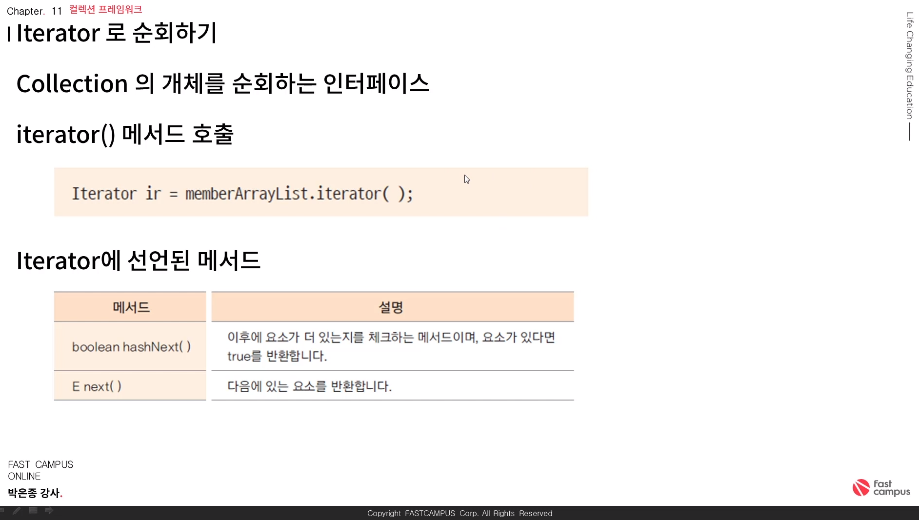 - Iterator는 반복자라고 부르며 컬렉션 종류에 관계없이 같은 방법으로 프로그래밍 할 수 있게 해 준다.