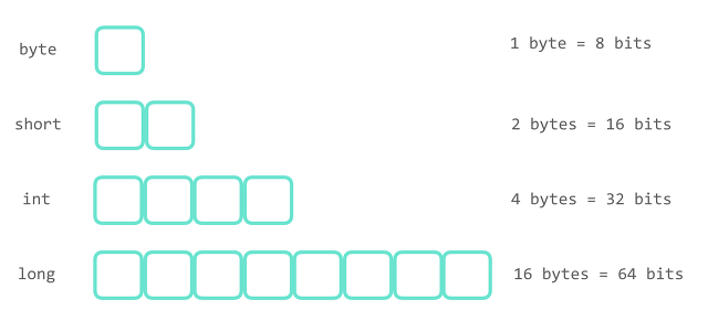 byte, short, int, long은 모두 정수를 표현하기 위한 자료형이다. 표현하고자 하는 자료(data)가 같으므로 한 포스트에서 같이 정리하고 비교하는것이 이해하기 더 효율적이라 판단해 한 포스트에서 다루게 되었다. 다시 말하지만 byte, short, int, long은 모두 정수를 표현하기 위한 자료형이다. 그렇다면 왜 한 자료(data)를 표현하는데 이렇게 많은 자료형이 필요할까? 바로 메모리 제약 때문이다. 각 자료형은 정수를 표현하지만 그 정수를 표현 할 수 있는 범위가 존재한다. 이 범위는 해당 자료형에 할당된 메모리 크기에 비례한다. 우리 소프트웨어 엔지니어들은 우리가 개발하는 소프트웨어가 어떤 데이터를 필요로하고 이 데이터가 어떤 범위내에 존재하는지 파악하여 이를 표현하기 위한 가장 적합한 자료형을 찾아야한다. 가장 메모리 활용성이 좋은 자료형을 찾는게 좋다. 그럼 이제 정수형 자료형들의 크기에 대해 알아보자.